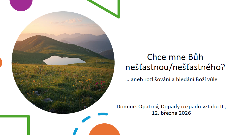 Při rozpadu vztahu se člověku často bolestně vtírá otázka, zda Bůh opravdu chce, aby zůstal v neštěstí, nebo dokonce trpěl „pro dobro“. Prezentace Dominika Opatrného ukazuje, že křesťanská tradice nabízí mnohem hlubší a lidštější pohled. Nejde o moralizování ani o jednoduché návody, ale o cestu, která vede k životu, k pravdivosti a k postupnému uzdravování. Základní biblické poselství je jasné: Bůh chce, aby člověk žil – a žil v hojnosti. Ježíš sám říká: „Já jsem přišel, aby měly život a měly ho v hojnosti“ (Jan 10,10). Křesťanská etika proto není o předhazování nedokonalostí, ale o hledání dobrého, smysluplného a naplněného života.