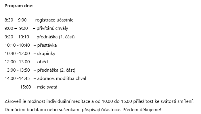 Nabízí se možnost individuální meditace a od 10.00 do 15.00 příležitost ke svátosti smíření.