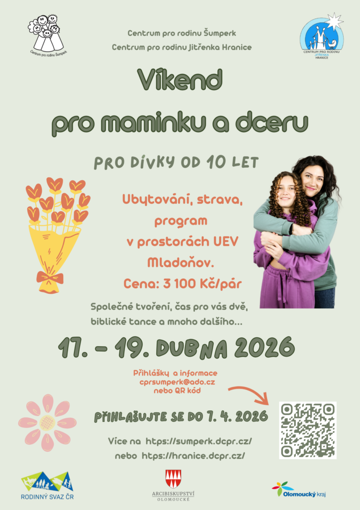 Centrum pro rodinu Šumperk a Centrum pro rodinu Jitřenka Hranice zvou na třetí ročník Víkendu pro maminku a dceru, který proběhne v krásně rekonstruovaných prostorách Ústavu ekologické výchovy v Mladoňově od 17. do 19. dubna 2026. Přihlášení níže.