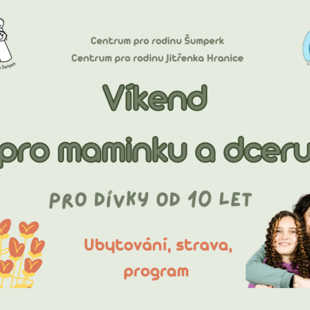 Centrum pro rodinu Šumperk a Centrum pro rodinu Jitřenka Hranice zvou na třetí ročník Víkendu pro maminku a dceru, který proběhne v krásně rekonstruovaných prostorách Ústavu ekologické výchovy v Mladoňově od 17. do 19. dubna 2026. Přihlášení níže.